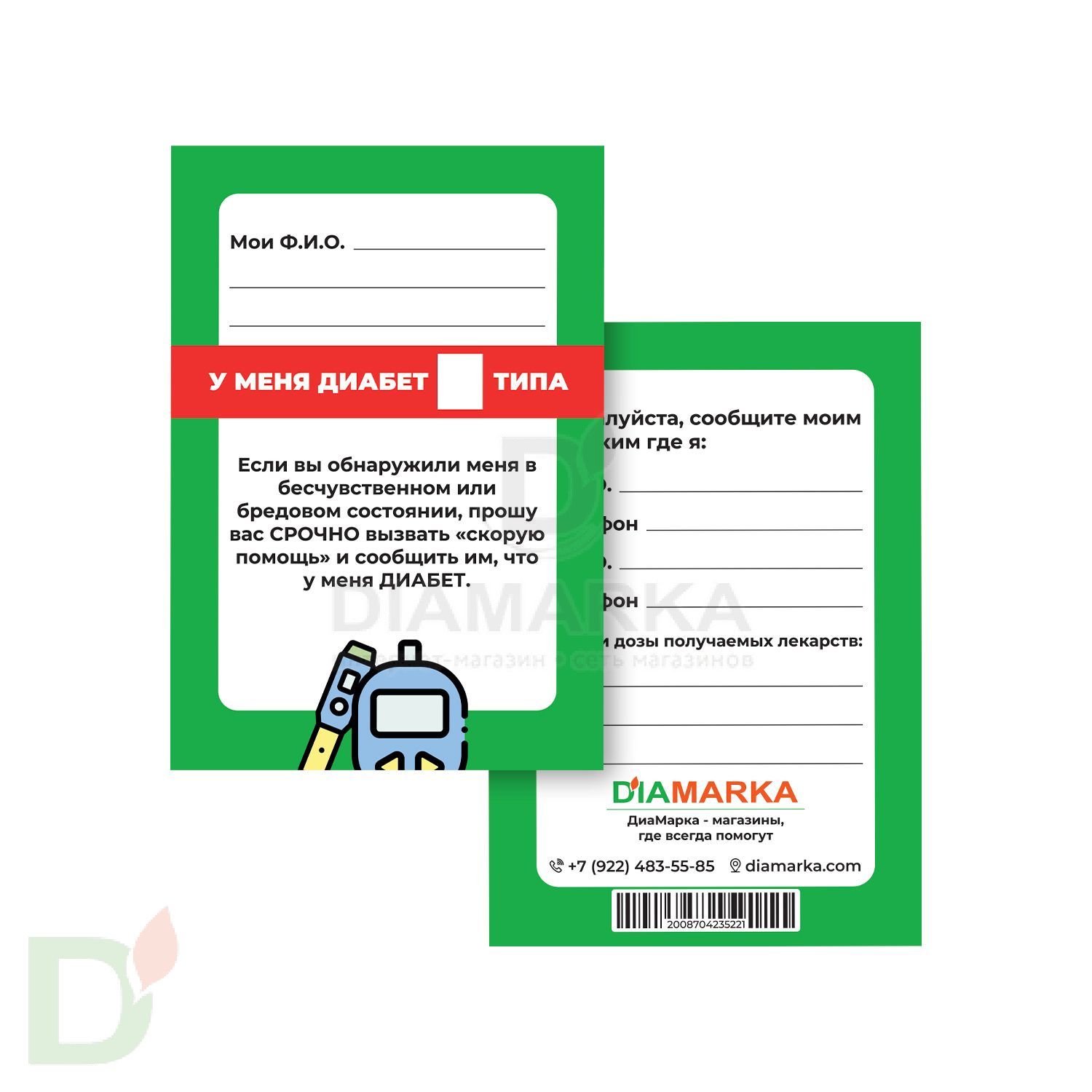 Паспорт диабетика — не просто карточка, а важный элемент безопасности. В случае непредвиденной ситуации, такой как потеря сознания или резкое ухудшение самочувствия, эта карточка может сыграть ключевую роль. Она содержит поля для заполнения ваших данных: ФИО, диагноз, контактные телефоны близких. Благодаря этому любой неравнодушный человек рядом сможет быстро понять, что делать, и связаться с теми, кто вам дорог.